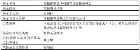 中国经济网北京11月25日讯 近日,交银施罗德基金管理有限公司公告,张顺晨离任交银增利债券,魏玉敏管理。