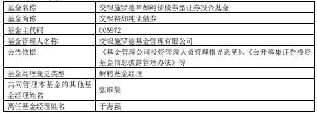 于海颖离任交银裕如纯债债券 张顺晨管理