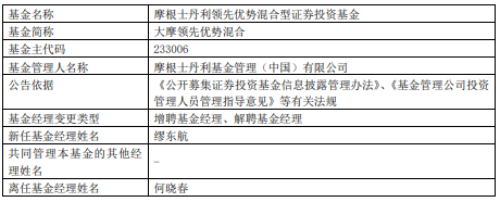 中国经济网北京11月25日讯 近日,摩根士丹利基金管理(中国)有限公司公告,大摩领先优势混合增聘基金经理缪东航,何晓春离任。