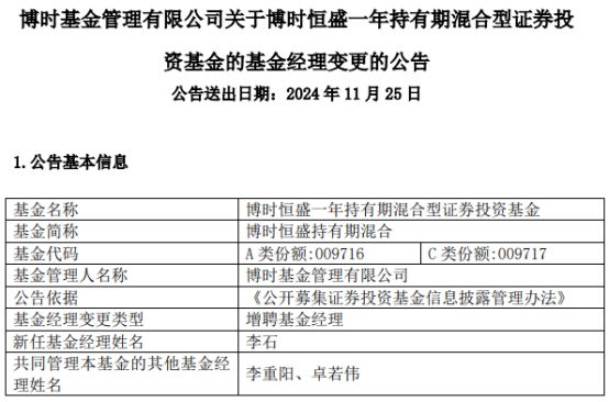中国经济网北京11月25日讯 今日,博时基金管理有限公司公告称,博时恒盛持有期混合(A类009716;C类009717)增聘基金经理李石。