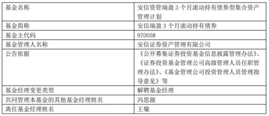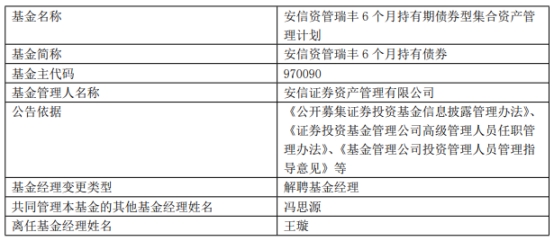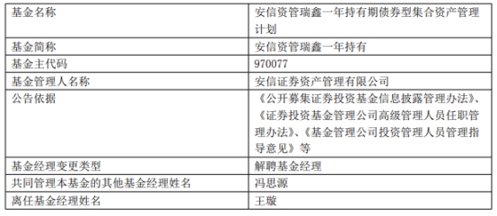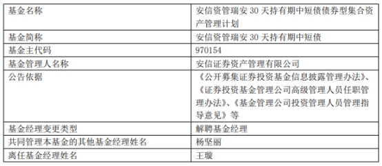 中国经济网北京11月26日讯 今日,安信证券资产管理有限公司公告称,王璇离任安信资管瑞安30天持有期中短债、安信资管瑞丰6个月持有债券、安信瑞盈3个月滚动持有债券、安信资管瑞元添利、安信资管瑞鑫一年持有。