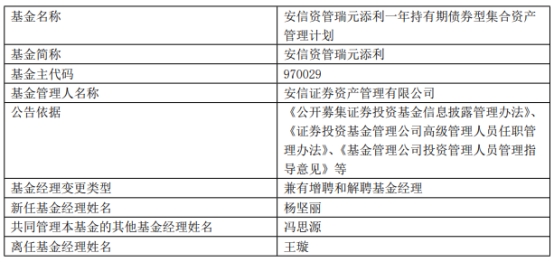 安信资管瑞元添利增聘基金经理杨坚丽。杨坚丽有多年证券从业经历,曾任职于中国中投证券研究所研究员、资产管理部投资主办、国信证券资产管理部投资主办。2016年9月加入国投证券资产管理部,现任国投证券资产管理有限公司投资经理。