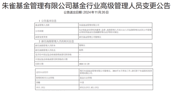 中国经济网北京11月26日讯 今日,朱雀基金管理有限公司发布高级管理人员变更公告。公告称,赵艳任公司督察长。
