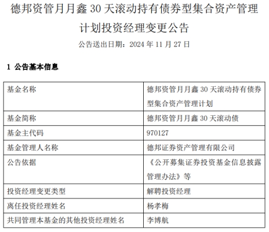 杨孝梅离任德邦资管月月鑫30天滚动债