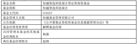 中国经济网北京11月27日讯 今日,恒越基金管理有限公司公告,赵炯离任恒越智选科技混合、恒越研究精选混合。