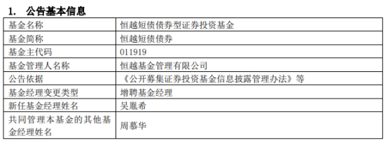 中国经济网北京11月28日讯 今日,恒越基金管理有限公司公告称,恒越短债债券(A类011919;C类011920;D类019112)增聘基金经理吴胤希。