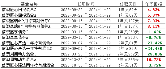 比如在2020年10月30日首次管理的信澳匠心臻选两年持有期混合基金来看,在管理了4年31天后,其累计任职回报还亏损了3.72%。另一只同日管理的信澳周期动力混合A,回报为16.72%,但这主要得益于2021年股市的整体反弹,在此后的2年里该基金分别下跌了19.58%和11.46%。