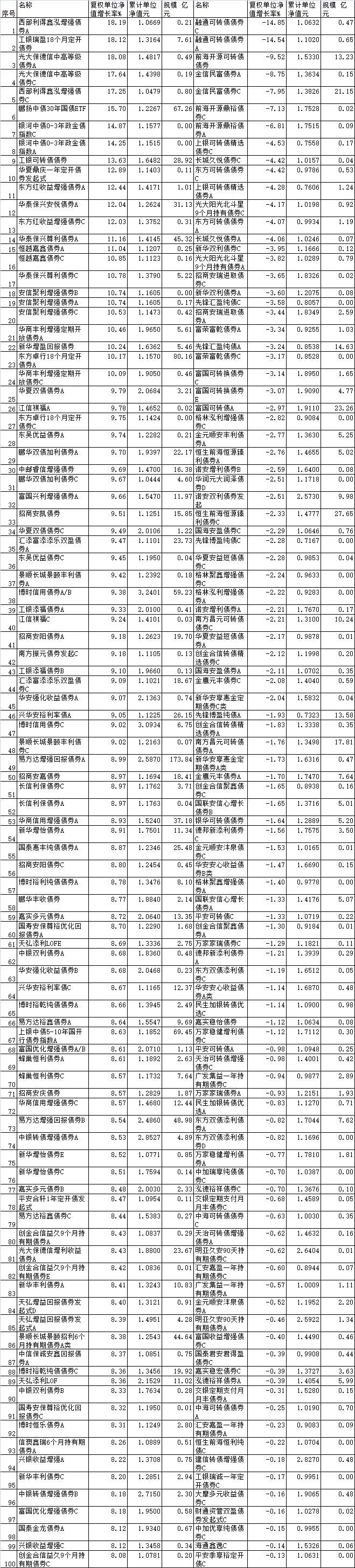 涨幅排名中,西部利得鑫泓增强债券A、工银瑞盈18个月定开债券、光大保德信中高等级债券A、光大保德信中高等级债券C、西部利得鑫泓增强债券C以18.19%、18.12%、18.08%、17.64%、17.25%的涨幅居前。