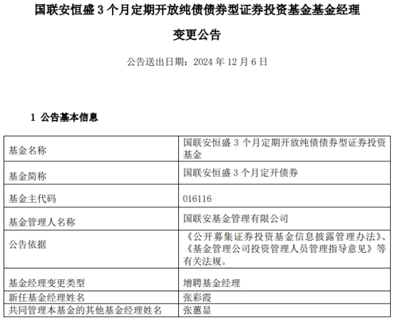 中国经济网北京12月6日讯 今日,国联安基金管理有限公司公告称,国联安恒盛3个月定开债券(016116)增聘张彩霞。