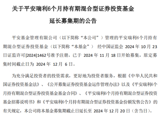 中国经济网北京12月6日讯 今日,平安基金管理有限公司发布关于平安瑞利6个月持有期混合型证券投资基金延长募集期的公告。公告称,平安瑞利6个月持有期混合于2024年11月18日开始募集,原定募集时间截止日为2024年12月6日,现决定将该基金募集期截止日延长至2024年12月20日(含当日)。