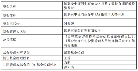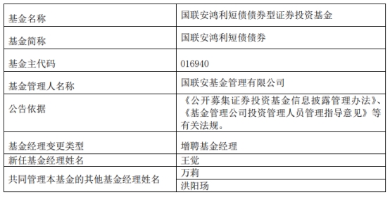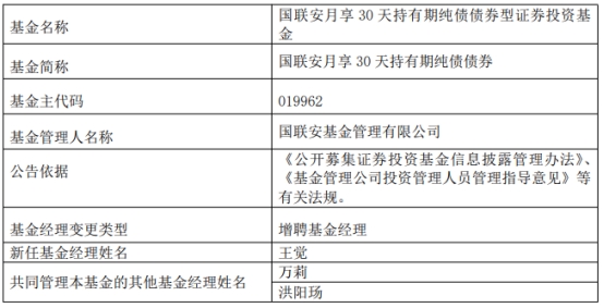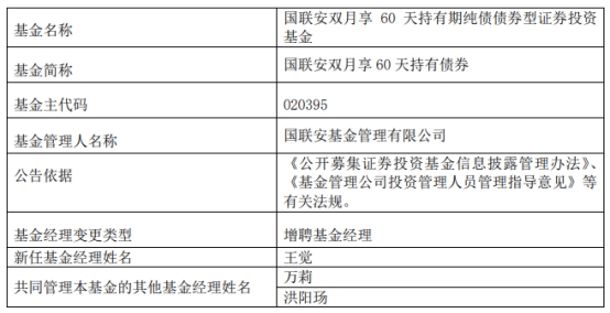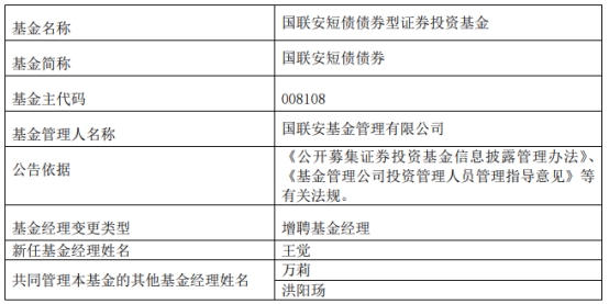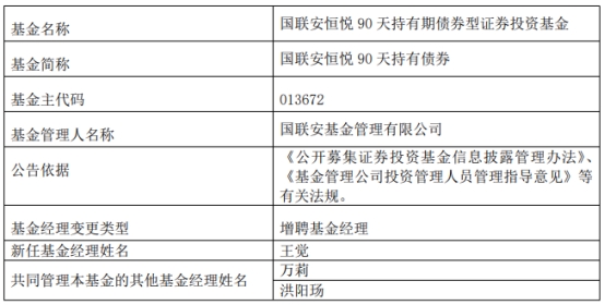 中国经济网北京12月10日讯 今日,国联安基金管理有限公司公告称,国联安双月享60天持有债券、国联安短债债券、国联安鸿利短债债券、国联安中证同业存单AAA指数7天持有期、国联安恒悦90天持有债券、国联安月享30天持有期纯债债券增聘基金经理王觉。