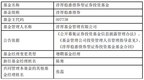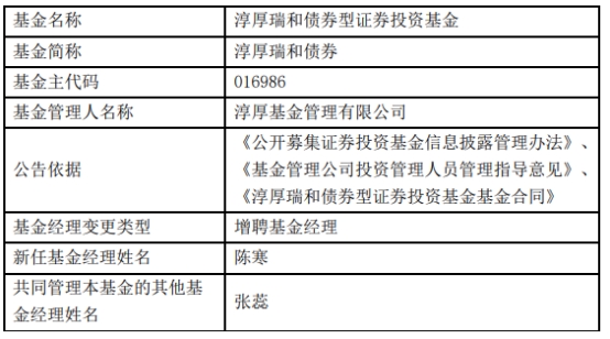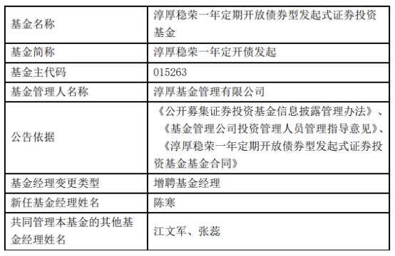 中国经济网北京12月11日讯 今日,淳厚基金管理有限公司公告称,淳厚稳荣一年定开债发起(015263)、淳厚瑞和债券(A类016986;C类016987)、淳厚稳惠债券(A类007738;C类007739)增聘基金经理陈寒。