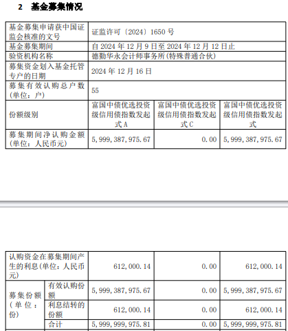 募集期间净认购金额5,999,387,975.67元,认购资金在募集期间产生的利息612,000.14元,募集份额合计5,999,999,975.81份。