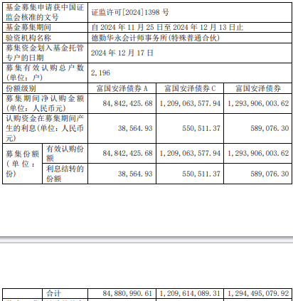 募集期间净认购金额1,293,906,003.62元,认购资金在募集期间产生的利息589,076.30元,募集份额合计1,294,495,079.92份。