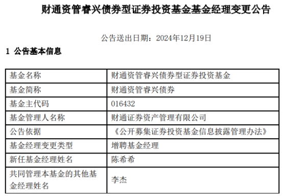 中国经济网北京12月19日讯 今日,财通证券资产管理有限公司公告称,财通资管睿兴债券(A类016432;C类016433)增聘基金经理陈希希。