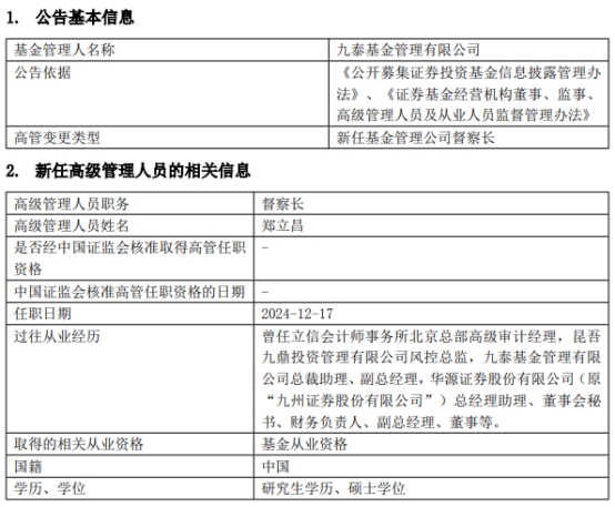 中国经济网北京12月19日讯 今日,九泰基金管理有限公司发布高级管理人员变更公告。公告称,郑立昌任公司督察长。
