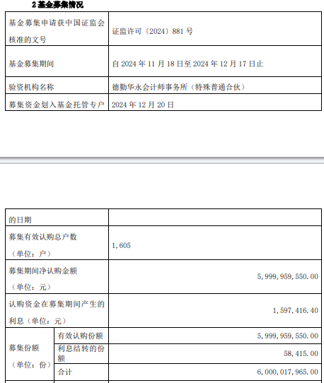 募集期间净认购金额5,999,959,550.00元,认购资金在募集期间产生的利息1,597,416.40元,募集份额合计6,000,017,965.00份。