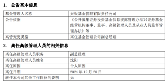 中国经济网北京12月23日讯 近日,兴银基金管理有限责任公司发布高级管理人员变更的公告。公告称,公司副总经理沈阳因个人原因于2024年12月20日离任。