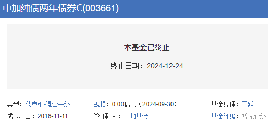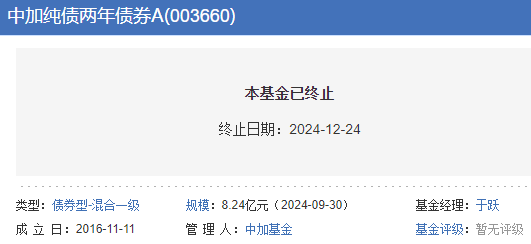 中加纯债两年债基清盘 规模超过8亿元