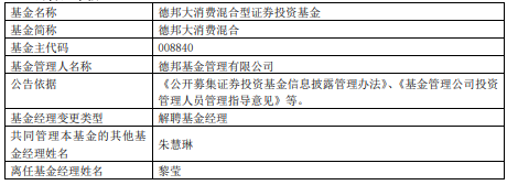 中国经济网北京12月25日讯 今日,德邦基金管理有限公司公告,黎莹离任德邦大消费混合,朱慧琳管理。