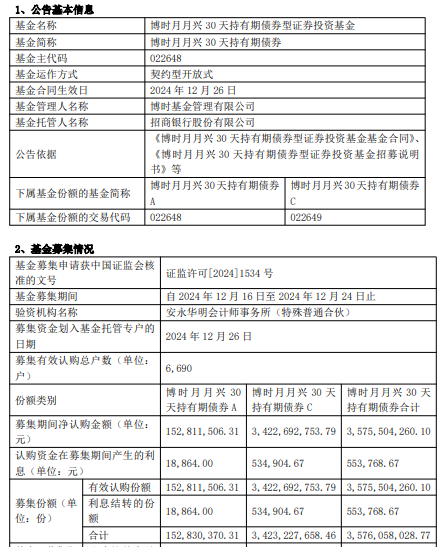 博时月月兴30天持有期债券成立 规模35.76亿元
