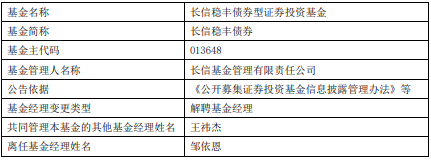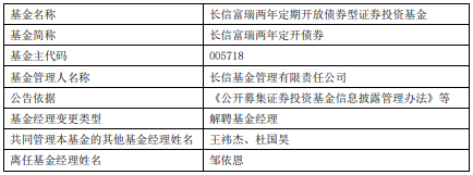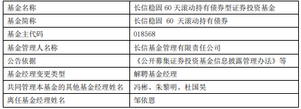 中国经济网北京12月27日讯 今日,长信基金管理有限责任公司公告,邹依恩离任长信稳固60天滚动持有债券、长信稳丰债券、长信富瑞两年定开债券。