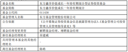 中国经济网北京12月30日讯 近日,东方基金管理股份有限公司公告,东方鑫享价值成长一年持有期混合增聘基金经理房建威,陈皓离任。