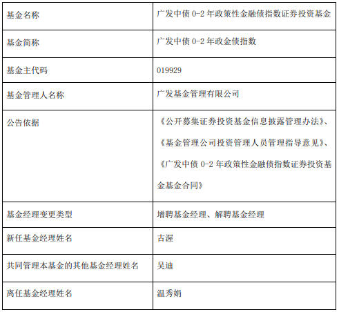 中国经济网北京12月30日讯 近日,广发基金管理有限公司公告,广发政策性金融债增聘基金经理古渥、高翔,洪志、赵子良离任。