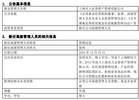 公告显示,张帅2013年加入上海光大证券资产管理有限公司,历任渠道销售经理、产品经理、销售团队团队长、机构业务部总经理,现任公司营销总监兼机构业务部总经理。