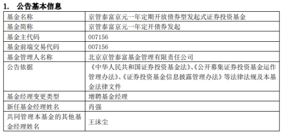 京管泰富京元一年定开债券发起增聘肖强