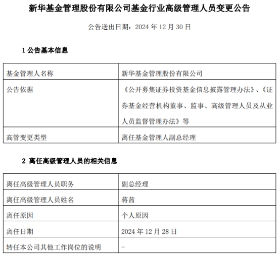 中国经济网北京12月30日讯 近日,新华基金管理股份有限公司发布高级管理人员变更公告。公告称,公司副总经理蒋茜因个人原因于2024年12月28日离任。