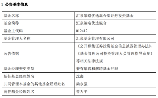 中国经济网北京12月30日讯 近日,汇泉基金管理有限公司公告称,汇泉策略优选混合(A类012412;C类013939)增聘基金经理沈鑫,曾万平离任。