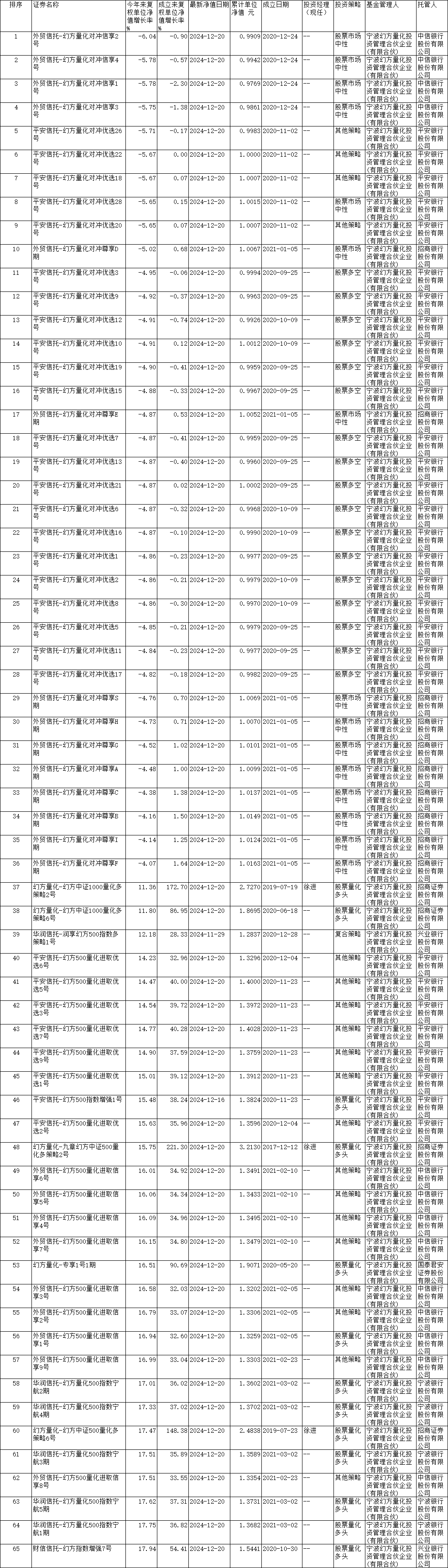 而36只年内下跌的基金则均为量化对冲系列产品,外贸信托-幻方量化对冲信享2号以6.04%的跌幅垫底,其余35只基金跌幅在4%至6%之间。