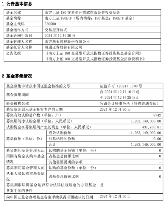 中国经济网北京12月31日讯 今日,南方基金管理股份有限公司发布南方上证180交易型开放式指数证券投资基金基金合同生效公告。