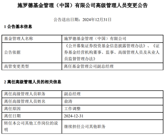 中国经济网北京12月31日讯 今日,施罗德基金管理(中国)有限公司发布高级管理人员变更公告。公告称,公司副总经理俞涛因工作调整于2024年12月31日离任,继续担任公司其他职务。