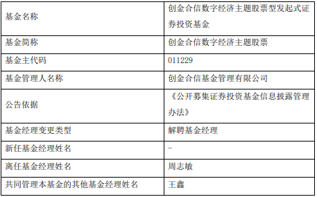 中国经济网北京1月3日讯 今日,创金合信基金管理有限公司公告,周志敏离任创金合信数字经济主题股票。