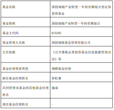中国经济网北京1月3日讯 今日,国投瑞银基金管理有限公司公告,国投瑞银产业转型一年持有期混合增聘基金经理朴虹睿。