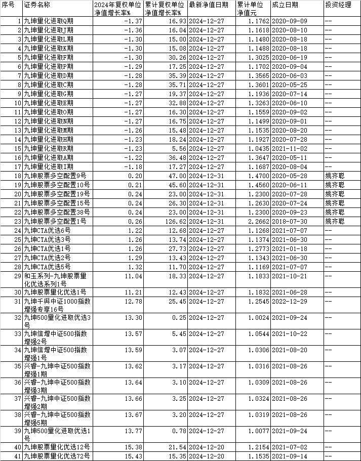 九坤投资截至去年12月份基金业绩一览