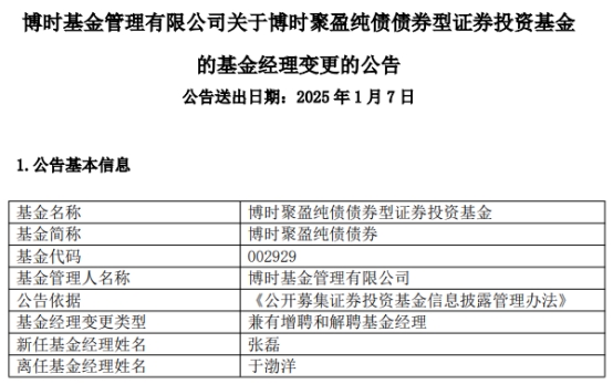 中国经济网北京1月7日讯 今日,博时基金管理有限公司公告称,博时聚盈纯债(002929)增聘基金经理张磊,渤洋离任。