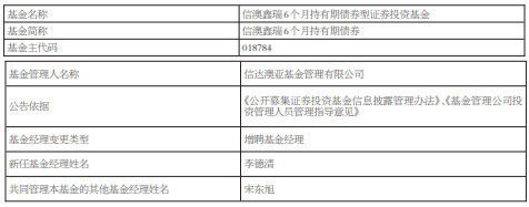 中国经济网北京1月8日讯 今日,信达澳亚基金管理有限公司公告,信澳鑫瑞6个月持有期债券增聘李德清。
