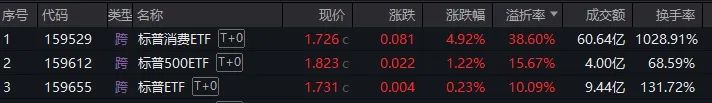 不过,上述QDII-ETF大涨的背后伴随着高溢价的风险,标普消费ETF场内价格相对IOPV(每日参考净值)已经产生38.6%的溢价率,标普500ETF、标普ETF溢价率均超10%,合计共有26只跨境ETF溢价率超5%。