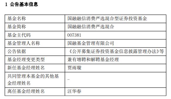 国融融信消费严选混合换将 增聘贾雨璇解聘汪华春