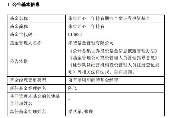 中国经济网北京1月14日讯 今日,朱雀基金管理有限公司发布基金经理变更公告,朱雀匠心一年持有期混合型证券投资基金(简称:朱雀匠心一年持有)增聘基金经理陈飞,并解聘基金经理梁跃军、张璇。