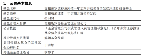 中国经济网北京1月15日讯 今日,交银施罗德基金管理有限公司公告称,季参平离任交银裕道纯债一年定期开放债券发起(014464)。