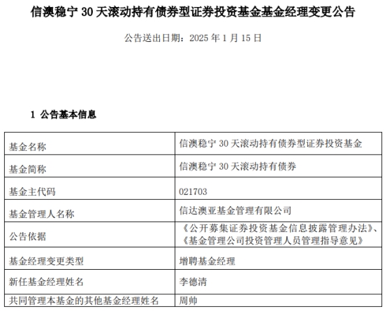 中国经济网北京1月15日讯 今日,信达澳亚基金管理有限公司公告称,信澳稳宁30天滚动持有债券(A类021703;C类021704)增聘基金经理李德清。