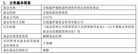 中国经济网北京1月15日讯 今日,交银施罗德基金管理有限公司公告称,姬静离任交银裕盈纯债债券(A类519776;C类519777;D类020344)。