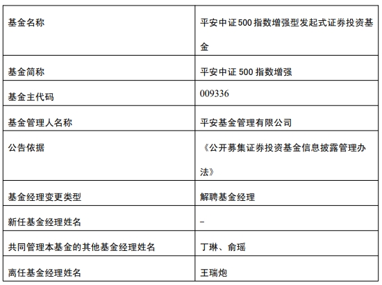 中国经济网北京1月15日讯 今日,平安基金管理有限公司公告,王瑞炮离任平安中证500指数增强。