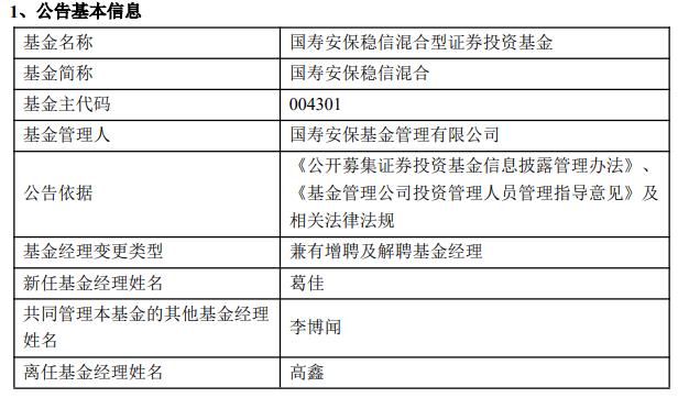 国寿安保稳信混合换将 增聘葛佳解聘高鑫