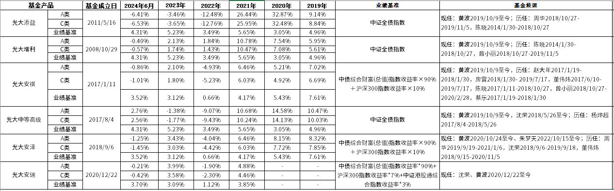 ① 近一年业绩数据截至2024/12/31,已经托管行复核。光大增利业绩比较基准为中证全债指数,近一年涨幅为8.83%。排名数据来源自银河证券,截至2024/12/31,同类为普通债券型基金。光大增利正收益的数据来源于历年年报,正收益仅表示每年度报告截止日基金收益数据为正,不表示每年度任一区间基金的业绩表现情况。光大增利A自2008年成立以来,每个自然年度业绩及业绩比较基准分别为2009年1.86%、0.27%,2010年9.11%、2.00%,2011年3.57%、3.79%,2012年7.62%、4.03%,2013年-9.27%、1.78%,2014年11.62%、10.82%,2015年9.71%、8.74%,2016年0.54%、2.00%,2017年0.99%、-0.34%,2018年5.29%、8.85%,2019年5.60%、4.96%,2020年7.54%、3.05%,2021年10.78%、5.65%,2022年1.84%、3.49%,2023年2.13%、5.23%,2024年9.55%、8.83%;光大增利C自2008年成立以来,每个自然年度业绩及业绩比较基准分别为2009年1.57%、0.27%,2010年8.62%、2.00%,2011年2.87%、3.79%,2012年7.21%、4.03%,2013年-9.60%、1.78%,2014年11.25%、10.82%,2015年9.11%、8.14%,2016年0.28%、2.00%,2017年0.55%、-0.34%,2018年4.79%、8.85%,2019年5.60%、4.96%,2020年7.08%、3.05%,2021年10.47%、5.65%,2022年1.43%、3.49%,2023年1.74%、5.23%,2024年9.19%、8.83%,2024年业绩及业绩基准已经托管行复核,截至2024.12.31。