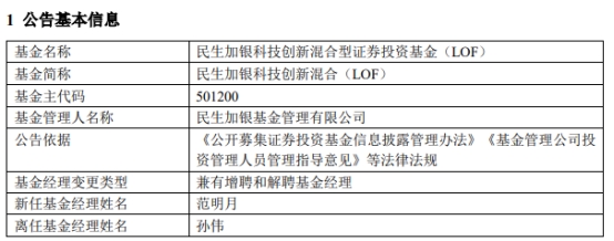 中国经济网北京1月20日讯 今日,民生加银基金管理有限公司公告称,民生加银科技创新混合(LOF)(501200)增聘基金经理范明月,孙伟离任。